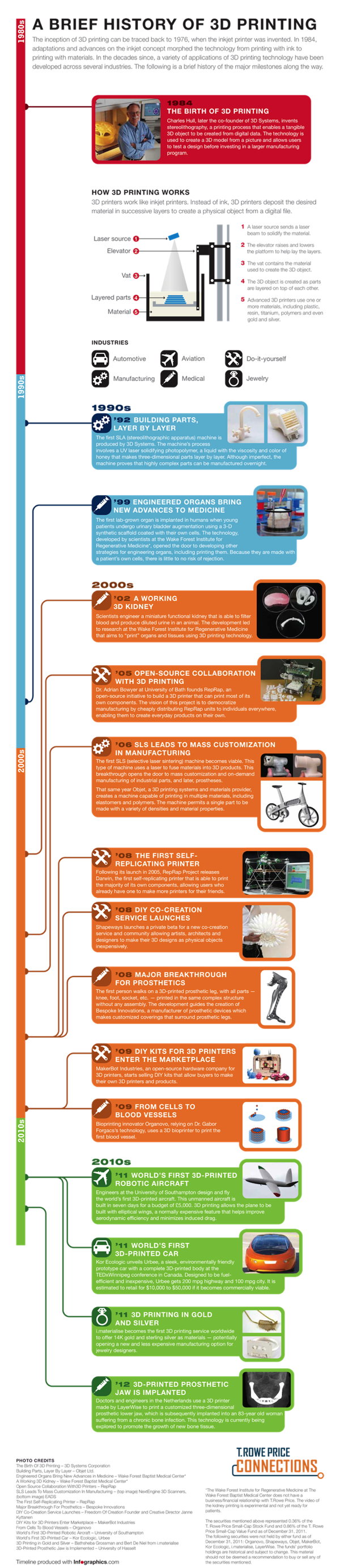 Rok 1993 to także narodziny jednej z najpopularniejszych technologii przyrostowych, nazwanej po prostu „drukiem 3D” (3 Dimensional Printing techniques). Jej twórcami byli naukowcy Massachusetts Institute of Technology (MIT), którzy opracowali metodę tworzenia modeli przestrzennych z proszku gipsowego, spajanego selektywnie natryskiwanym lepiszczem. Do pracy wykorzystano technologię znaną z drukarek atramentowych, które w tym rozwiązaniu zamiast atramentu na papier nanosiły klej na proszek gipsowy.