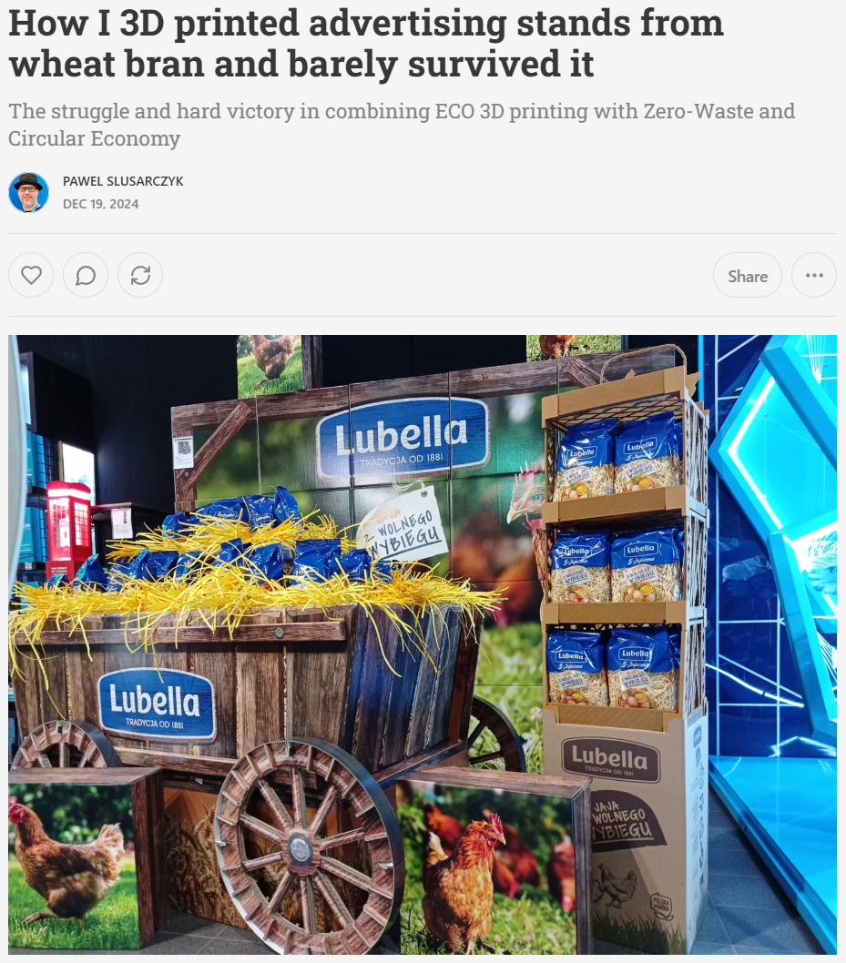- Pierwotny model biznesowy stojący za decyzją o zakupie wszystkich tych drukarek 3D nie zakładał klasycznych usług druku 3D. Endery 3 MAX i Endery 3 V2 drukowały innowacyjne standy reklamowe wykonane z naszego autorskiego biodegradowalnego materiału na bazie otrębów pszennych; opisałem to tutaj: