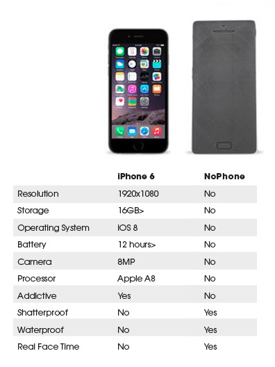 W przeciwieństwie do zwykłych telefonów, NoPhone ma szereg przewag i zalet: nie trzeba pamiętać aby go ładować, nie trzeba obawiać się, że się popsuje po upadku, nie trzeba martwić się co z nim zrobić w Śmingus-Dyngus. W sumie jedyne co mu grozi to spalenie.