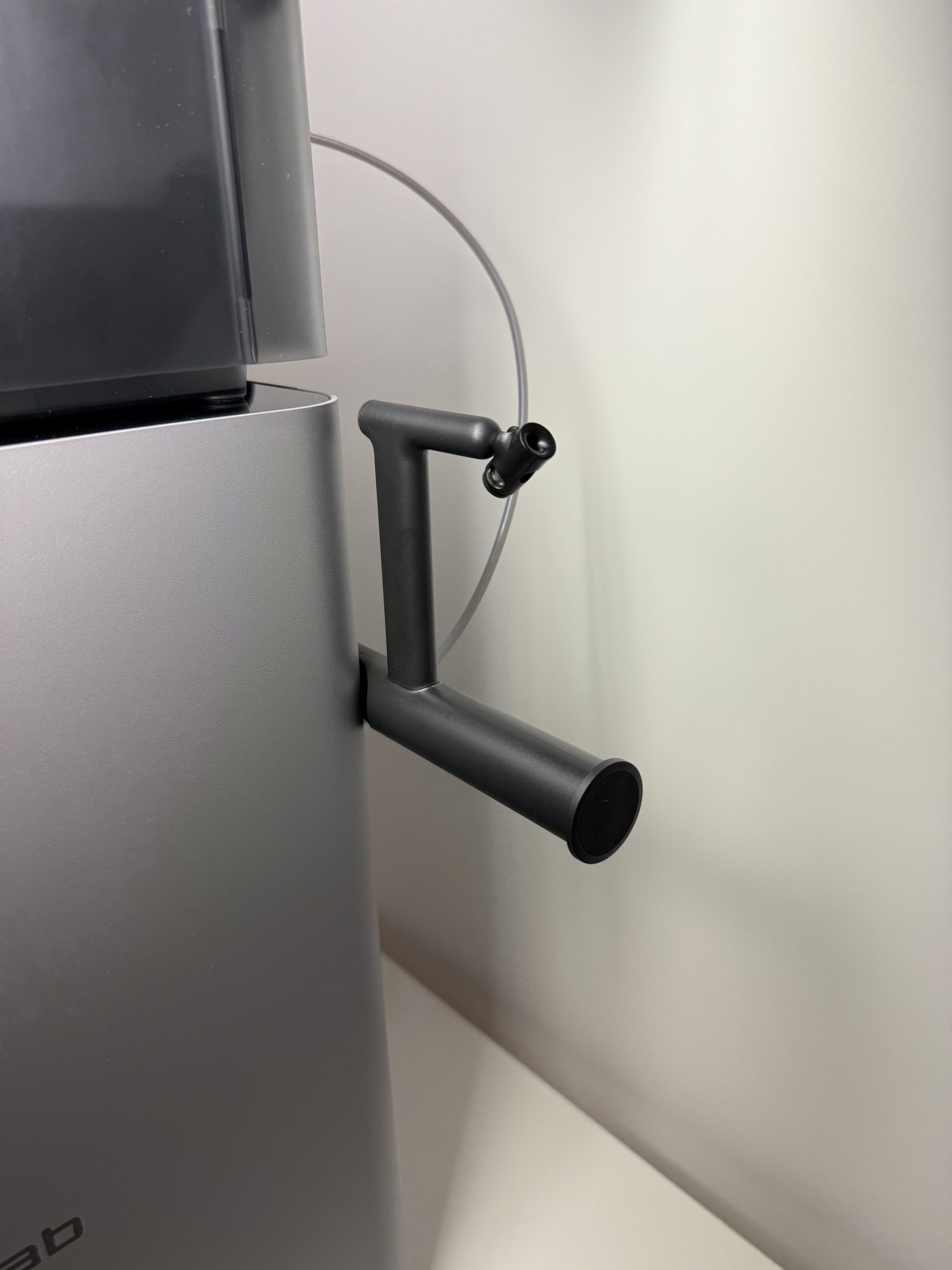 Uchwyt na zewnętrzną szpulę filamentu zamontowany w drukarce Bambu Lab P2S. Drukowany model uchwytu jest fabrycznie zapisany w pamięci drukarki i może zostać wykonany bez użycia komputera.